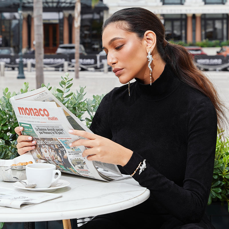 At the terrace of Hotel de Paris, bathed in the morning light. Draped in ORLOV jewelry, each piece caught the sunlight, casting a dazzling display of sparkles as she gazed over the serene beauty of Monaco.